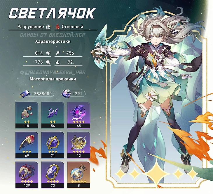 Светлячок – Охотница за Стелларонами в Honkai Star Rail. Вместе с Кафкой, Серебряным Волком и Блэйдом он служит Элио взамен на исполнение некой мечты. Геймплейно Светлячок является основным дамагером пути Разрушения с огненным уроном, ее механики схожи с Блэйдом или Кларой.