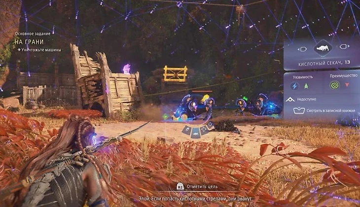 Нужно уничтожить несколько машин. Одним из них является новый тип машины: кислотный секач, который слаб к электрическому урону и силен против кислотного урона.