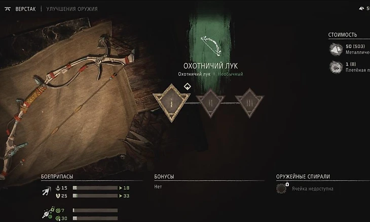 В меню верстака выберите «Улучшения оружия», затем «Охотничий лук» и «Улучшение первого уровня». Теперь можете создавать кислотные стрелы – тип стрел, которые разъедают машины, делая их более уязвимыми для обычных и улучшенных стрел.