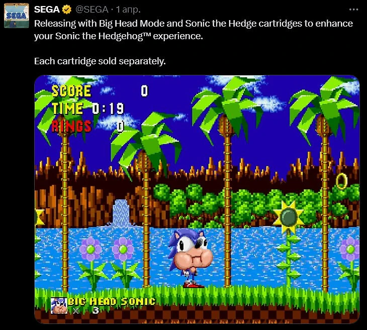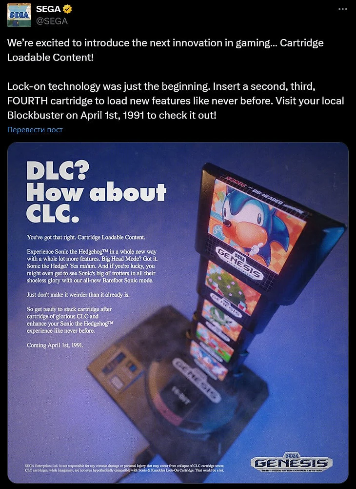 Sega бахнула по ностальгии, продемонстрировав приставку с возможностью включать все картриджи сразу. Выход запланирован на 1 апреля 1991 года, заряжайте машины времени заранее.