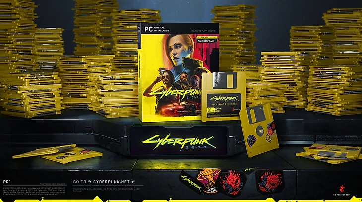 Польская компания позаботилась об обладателях древних компьютеров – не просто древних, а доисторических. Cyberpunk 2077 вышел на 3,5-дюймовых дискетах, получилось 97 619 штук. Разработчики подсчитали, что для хранения такого количества дискет понадобится комната 3 на 3, в которой все будет забито от пола до потолка, а на установку уйдет около двух месяцев.
