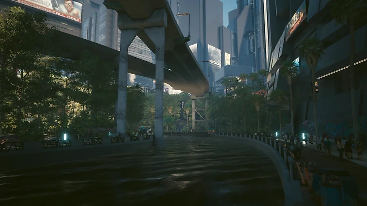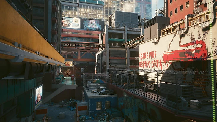 Несмотря на свою самобытность, я не могу сказать, что Найт-Сити является городом, которые чем-то может похвастаться в сравнении с другими репрезентациями культуры киберпанка в медиапространстве. Архитектурное наполнение является максимально хаотичным, а плотная застройка не оправдывает себя ввиду отсутствия контрастов между сооружениями, не считая минимальны отличия, которые не компенсируют повторение основных элементов застройки.