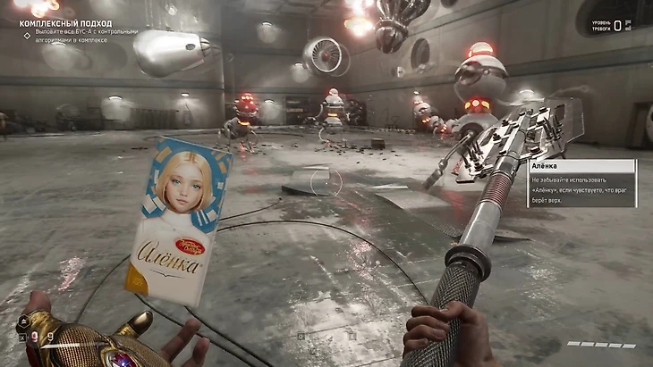 С новыми противниками поначалу было сложновато, так как нормального оружия у нас пока не было. Чуть позже нам дадут неплохое мощное копье «Клуша» и пулемет «Секатор», с которыми мы и будем веселиться на славу! Способности героя тоже будут недоступны, зато когда мы познакомимся с академиком Лебедевым, он восстановит Нечаеву полимерную перчатку, расскажет подробнее об Элеоноре и прояснит сложившуюся ситуацию. Теперь в нашем распоряжении будет «Техностазис» – мы сможем останавливать время, а также к нам вернется способность «Полимерный щит». Потом нам будет доступно некоторое оружие из основной игры. Заботливая Элеонора дала Нечаеву шоколадку «Аленка» – нейроимпульсный пусковой бок, способный создать мощный вихрь и заАОЕшить толпу врагов. Это очень полезная штука, которая вовремя нас выручала.