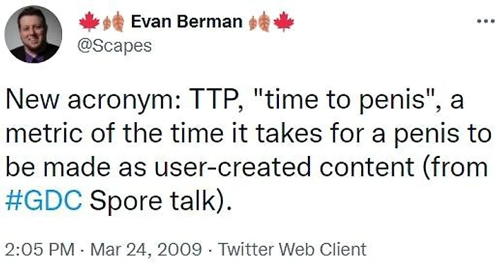 Впервые термин появился при разработке симулятора бога Spore. Maxis, знаменитая по обширным системам крафта, подсчитала, что игроки рисуют член практически моментально после запуска. Об этом разработчики рассказали на популярной конференции GDC в 2009 году.