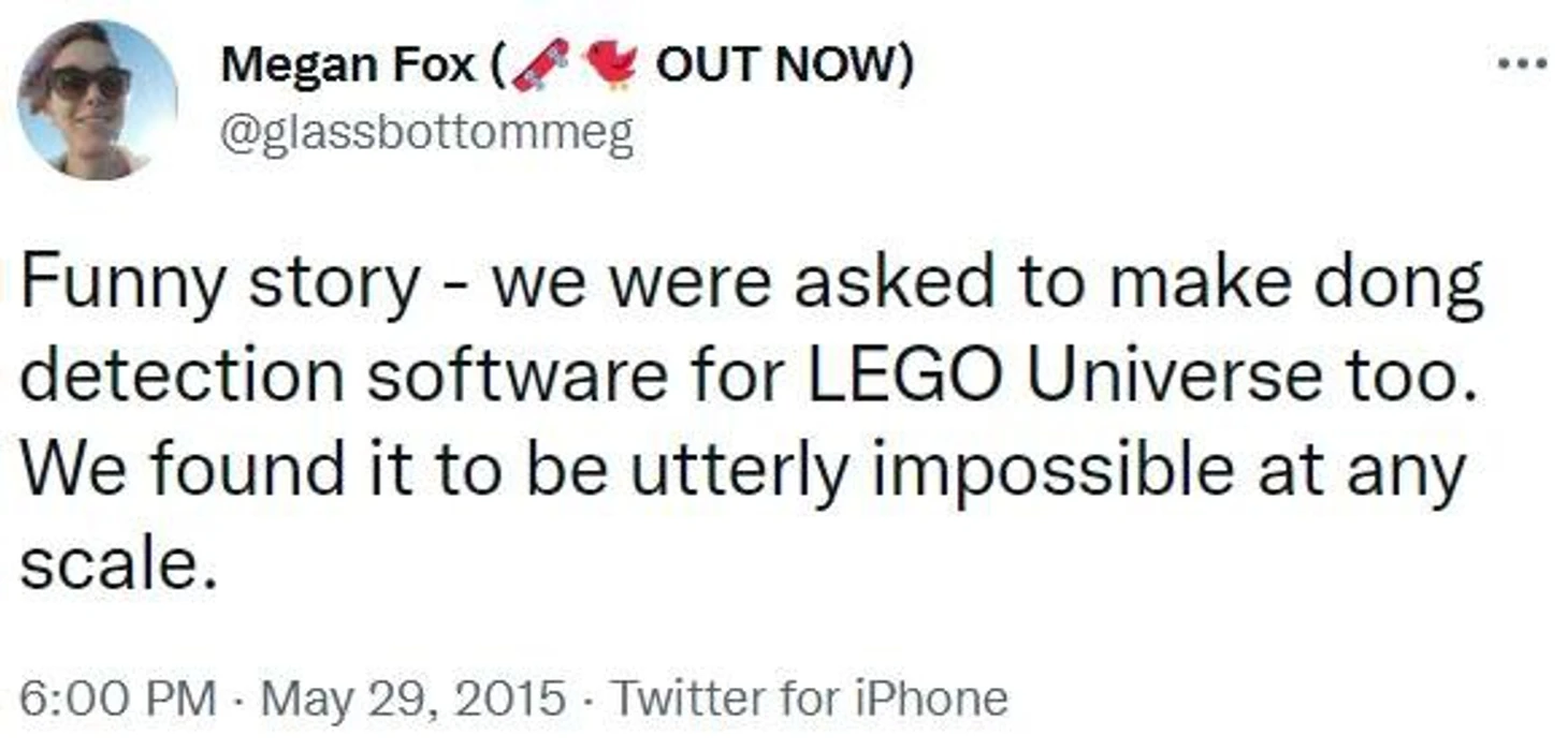 Метрика совершенно серьезная, потому что многие разработчики делают игры для детей, и дети первым делом рисуют известно что. Например, на GDC создатели Lego Universe рассказали, как они старались максимально оградить детей от рисования непотребностей. Другая разработчица тоже вспомнила, как попросили сделать инструмент для обнаружения членов для этой же игры.