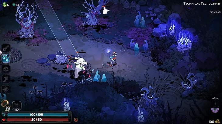 Одна из них – магия. Появление шкалы маны для персонажа-ведьмы было логичным ходом, появились интересные механики атак. Заряженные тратят магию, нанося больше урона и имея различные эффекты в зависимости от нажатой кнопки. Q – сковывающий сигил, наносящий урон после каста, ЛКМ – полоса урона перед собой и за спину, а ПКМ – заряженный снаряд. Это неплохое дополнение для боевой системы Hades и добавляет еще один параметр для менеджмента в боях, углубляя имеющиеся атаки дальше, чем затыкивание лучшей кнопки.