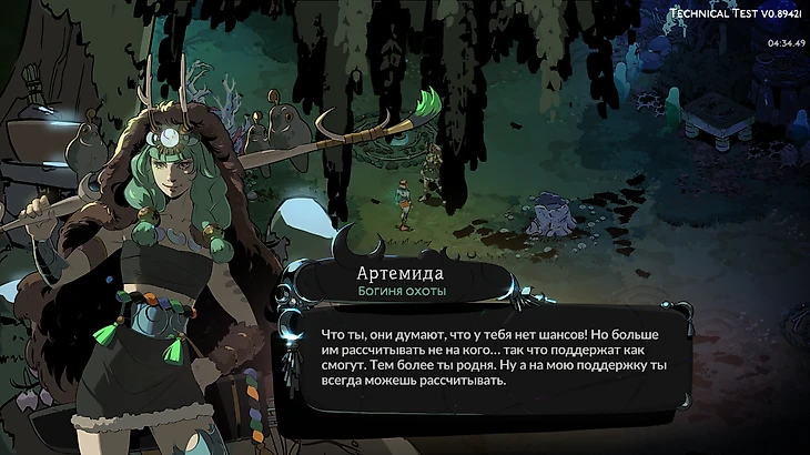 А теперь следите за руками. У героини есть наставница Геката, богиня Луны и колдовства, имеет покровительство богини Луны Селены (аналог Владыки Хаоса, использует ту же музыкальную тему и тоже комментирует происходящее во время забега) и дружит с богиней Луны и охоты Артемидой (та появляется во время забегов, примерно как это делал Танатос, помогая зачистить комнату, но теперь давая свой навык). Вместе с Гекатой героиня находится в Распутье (Crossroads) – зоне, куда нет доступа к Хроносу, домене Гекаты.
