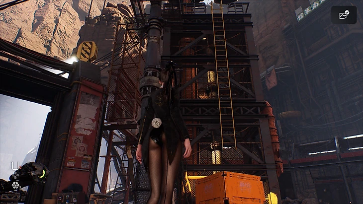 Сначала отыщите выступы на стене. Тащите к ним оранжевый ящик и хватайтесь за выступы. После короткого паркур-испытания вы доберетесь до платформы, где будет первая кнопка.