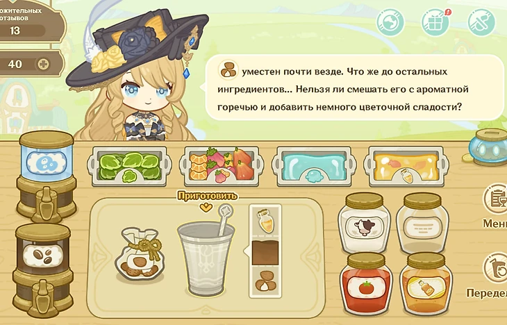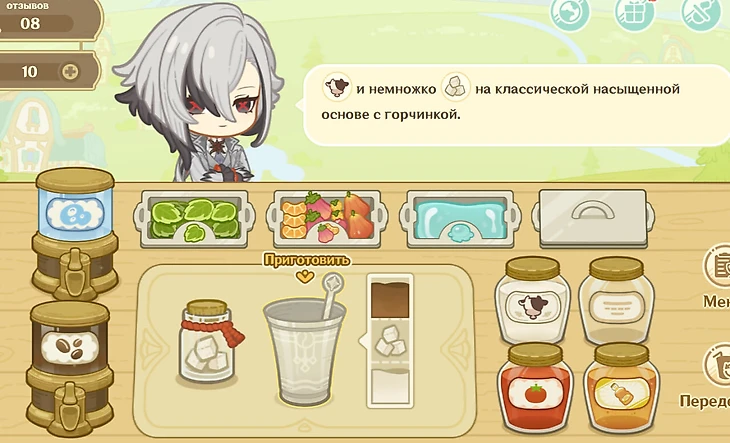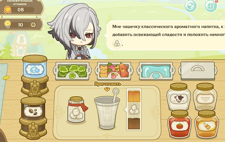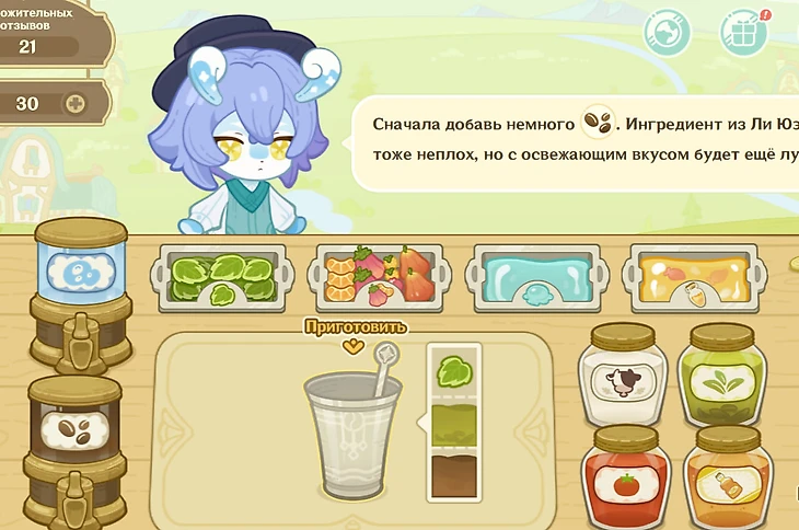 Мелюзина попросит сначала добавить немного кофе, ингредиент из Ли Юэ и освежающим вкусом. Ей нужно смешать кофе с зеленым чаем и добавить мяты.