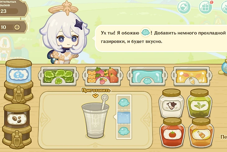 И, наконец, Паймон обожает слизь слайма с прохладной газировкой. Смешайте две слизи и воду.