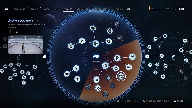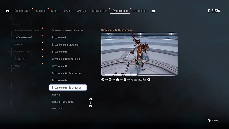 В Stellar Blade есть механики из слэшеров. Например, у героини полно комбо, с которыми она бьет по области или летает по арене. Они сильнее обычных ударов, и их можно усилить гаджетами. Чтобы изучить приемы, откройте меню, перейдите во вкладку «Руководство» и выберите «Серия приемов».