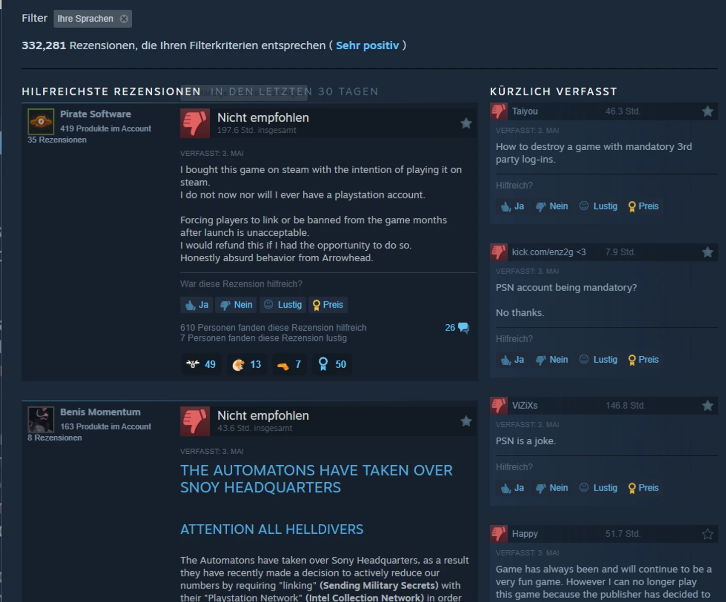 Пользователи Steam встретили новость с негодованием. В считанные часы они обвалили рейтинг Helldivers 2 и написали тысячи негативных отзывов.