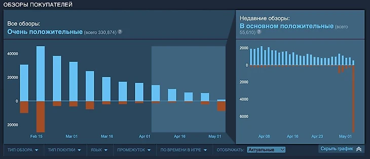На графике обзоров можно увидеть оба случая, когда у Helldivers 2 случился наплыв отрицательных отзывов. Первым был скандал с нерфом популярных пушек.