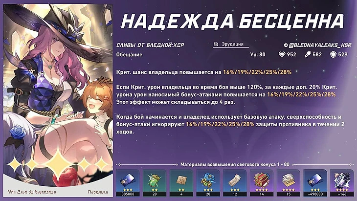 Оптимально набрать 1800 и больше силы атаки, 60% и больше крит. шанса, более 120% крит. урона и 135 скорости, либо больше скорости, чем у вашего основного дамагера, Брони и Искорки, чтобы баффнуть его до того, как Искорка или Броня подвинут его действие.