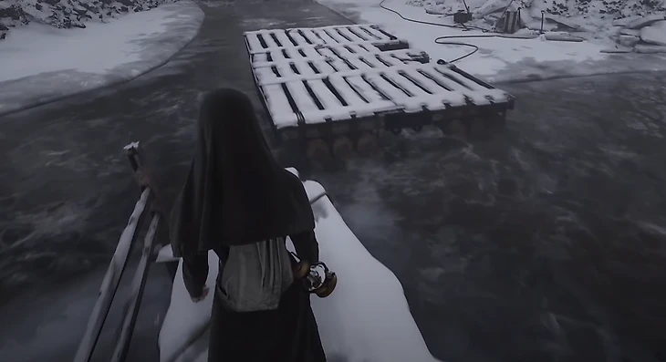 Дойдите до переправы, там увидите кат-сцену, после которой будет первая головоломка. Нажмите на рычаг и дождитесь, пока плот остановится на нужном берегу.