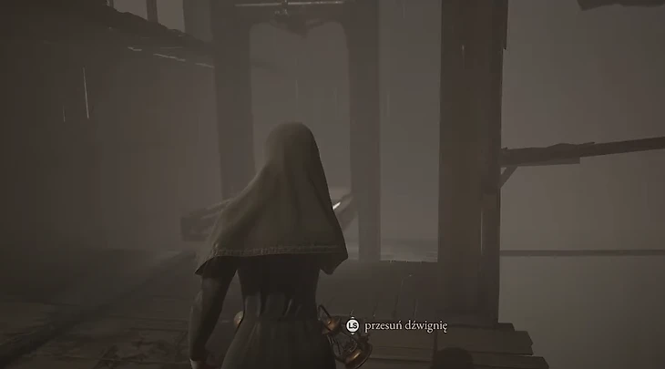 Далее в главе вам встретился лифт, возле которого героиня услышит голос. Начните молиться, чтобы выйти в другой мир. Развернитесь и пройдите по деревянной платформе направо. Выйдите в реальный мир, заберитесь выше, снова начните молиться и перейдите на противоположную сторону. После этого вы можете зайти в комнату рядом с лифтом и забрать «Складень».