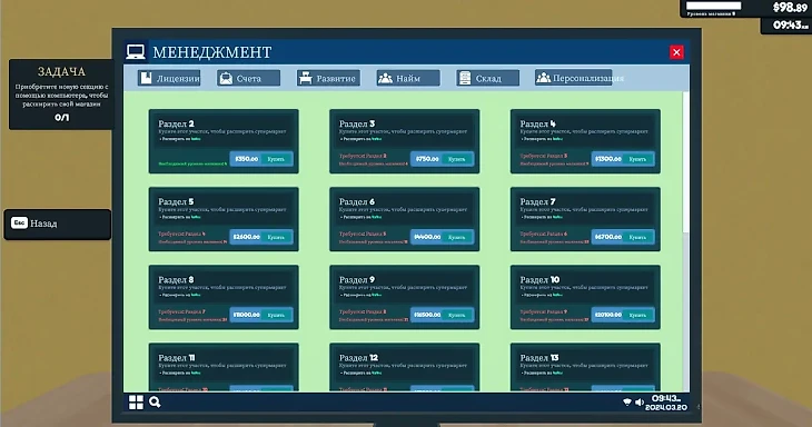 После приобретения новых лицензий на товары вы можете расширить магазин, чтобы поставить новые полки. Нужно зайти в раздел «Менеджмент» на компьютере и выбрать необходимый раздел. Только помните о том, что счета тоже повысятся. Если вы экономически не готовы, оставьте расширение до лучших времен.