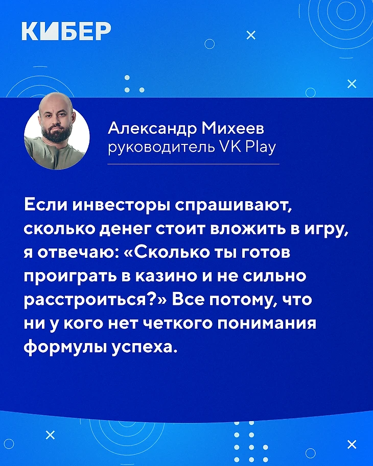 Если инвесторы спрашивают, сколько денег стоит вложить в игру, я отвечаю: «Сколько ты готов проиграть в казино и не сильно расстроиться?» Все потому, что ни у кого нет четкого понимания формулы успеха. Игры – сложный технологический продукт. Ты легко можешь ошибиться на любом этапе разработки, и это будет критически воспринято аудиторией. Тебе не зачтут прошлые успехи и не пожалеют за то, что ты по десять раз переделывал игру.