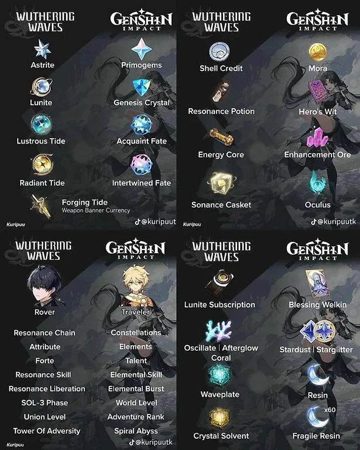 Это одинаковые вещи, названные по-другому. Из нового только особые крутки для оружейного баннера: в нем нельзя проиграть 50/50 (или 75/25), всегда выпадает лимитированное оружие. Баннер персонажей работает так же, только верхний лимит не 90 круток, а 80. Баннер новичка похож на Honkai Star Rail – 50 круток, пятизвездочный стандартный персонаж гарантирован. Причем с дебютной крутки в обучении всегда падает хилерша Байжи, с которой Скиталец знакомится в первые 15 минут прохождения.