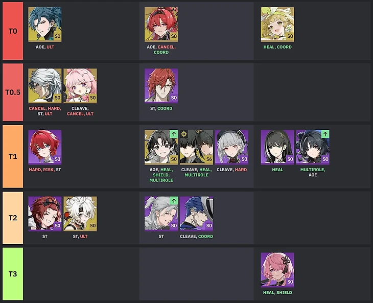 T1 – Jianxin (AoE, Heal, Shield, Multirole), Rover Spectro (Cleave, Heal, Multirole), Sanhua (Cleave, Hard);