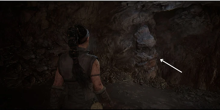 Продолжайте исследовать пещеру, пока не наткнетесь на небольшое подземное озеро. В него можно войти – Сенуа окажется по пояс в воде. Пройдите чуть вперед, а затем поверните направо. Лицо будет расположено справа от вас в каменной стене.