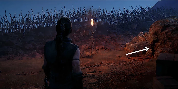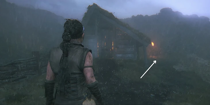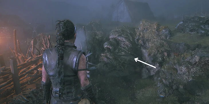 После получения зеркала Сенуи и последующей боевой сцены, Сенуа пройдет через развалины деревни, в том числе и полуразрушенный дом с висящим в центре трупом. Выйдя из разрушенного дома, поверните налево и направляйтесь к освещенному факелу. Подойдите к факелу, поверните направо и вы найдите первое лицо.