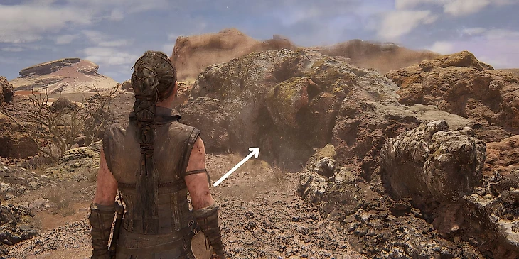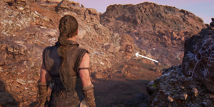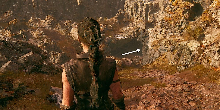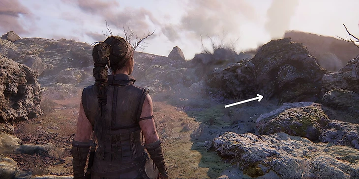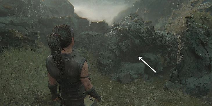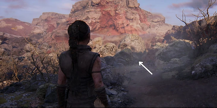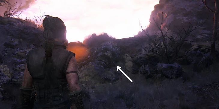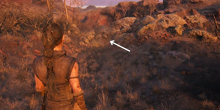 После нахождения третьего лица и дерева, вернитесь на тропу и продолжайте идти прямо. По пути вам будет встречаться много руин, но необходимо найти самые большие. Продолжайте путь, пока не увидите их. Они расположены слева от тропы. Подойдите к руинам, пройдите мимо них и поверните направо, пока не найдете небольшое отверстие, через которое Сенуа нужно пролезть. Отсюда дорога ведет вниз на поляну, через небольшой холм. Спуститесь вниз и вы увидете четвертое лицо – пропустить его будет невозможно.