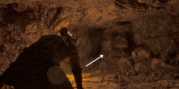 После того как вы зажжете первое синее пламя в пещерах, продолжайте свой путь по открывшейся тропе, пока не спуститесь вниз по уступу. Затем двигайтесь вправо, пока не найдете другой каменный светильник с синим пламенем. Нажмите на кнопку взаимодействия, чтобы потушить огонь. После того как огонь погаснет, развернитесь, и вы найдете другое каменное лицо на стене.