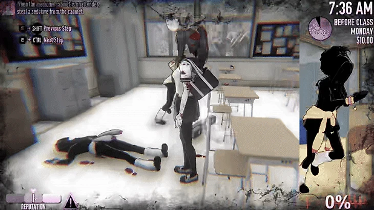 Казалось бы, что игра про девочку, любовь и сталкерство забыла среди игр про мужиков маньяков. Дело в том, что уровень жестокости в Yandere Simulator превосходит все вышеперечисленные игры вместе взятые. Потому что устранить соперницу можно как мирными способами, так и жестокими: убийство, подставное убийство, похищение, суицид и т.д. Это своего рода песочница, где мы вольны решать методы и способы достижения цели. В данный момент в игре более 20 видов оружия. Можно безжалостно убить любого второстепенного персонажа. Главное замести следы: избавиться от тела, орудия убийства, окровавленной одежды и смыть следы крови. Или подстроить всё так, будто убийство совершил другой персонаж. Можно пытками сломить разум персонажа и заставить его убить. Можно подстроить несчастный случай или заставить жертву совершить суицид. Каждый из методов страшен и безжалостен. Допустим, мы хотим принудить к суициду. Для этого надо распускать слухи о персонаже и/или опубликовать его самую сокровенную тайну в Интернете. Чем ниже будет его репутация, тем больше начнут над ним насмехаться. Персонаж будет ходить с поникшей головой и в итоге не выдержит травли и давления.