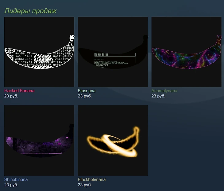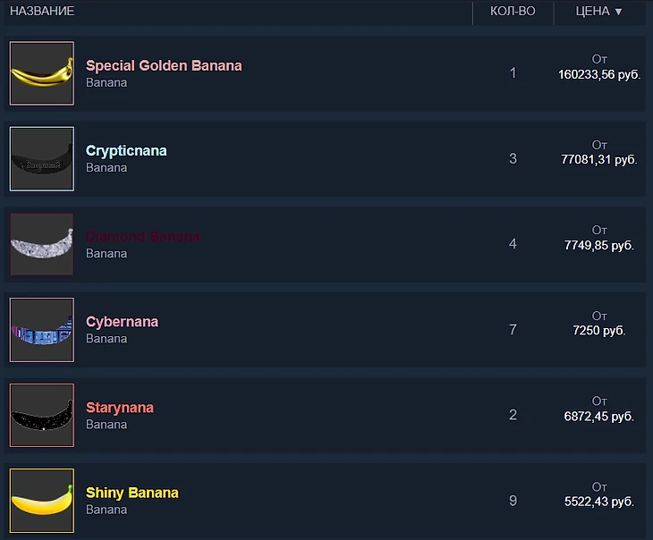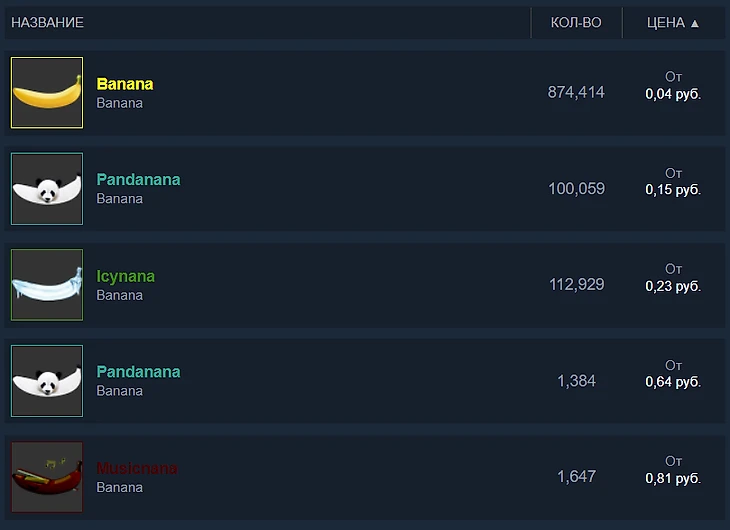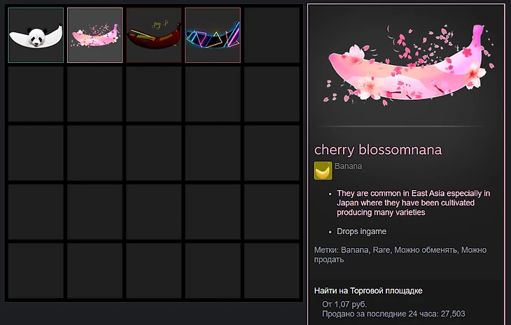 Цена на разные бананы на торговой площадке Steam постоянно меняется. Например, розовый банан cherry blossomnana неделю назад стоил 25 копеек, а сейчас уже более 1 рубля.