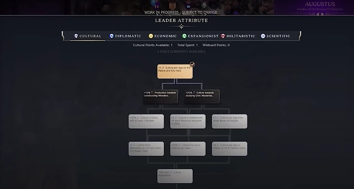 Лидеры в Civilization VII, как и раньше, – конкретные исторические личности со своими бонусами, чертами и целями. Например, у Августа один из бонусов лидера: +2 к производству в столице за каждый город. Лидеров можно выбрать один раз на всю игру. При этом теперь среди них не только главы государств, но и философы, религиозные лидеры и ученые (уже заявлен Конфуций).