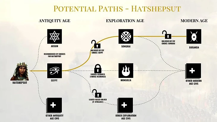 Например, для Хатшепсут исторически связаны Древний Египет (фараоном которого она была) и Аксумское царство, поскольку оно существовало в Африке в ту же историческую эпоху. Разработчики упоминали, что Хатшепсут сможет возглавить другие цивилизации античности, но не уточнили, будут ли ей доступны все или только соответствующие ее чертам, целям или региону появления.