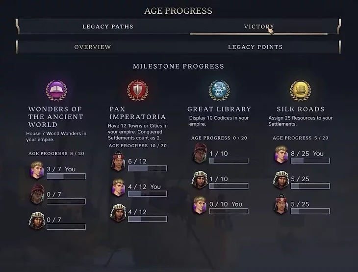 Если по завершении эпохи достигнуты все вехи одного из путей, цивилизация сможет выйти в Золотой век, дающий значительные бонусы. Например, выполнив все условия для уникального Золотого века Римской империи – Pax Imperatoria – в следующей эпохе игрок получит по бесплатному боевому юниту в каждом поселении.