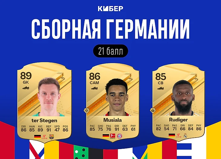Юлиан Нагельсманн продолжил смену поколений: отказался от нескольких звезд и выбрал четырех футболистов «Штутгарта», а карточки игроков сборной переливаются от могучего золота до серебряных оттенков. У Германии роскошные вратари (EA считает Марка-Андре тер Стегена немного сильнее Ману Нойера) и сильные игроки в разных линиях, но Тони Кроос и Илкай Гюндоган еле передвигаются по полям Ultimate Team. Настоящая сборная-загадка!