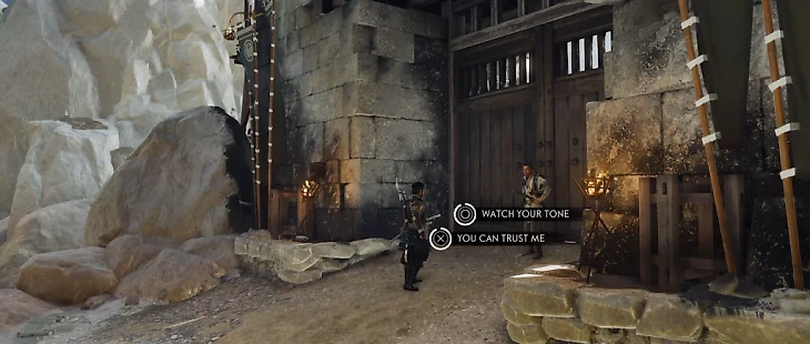Когда вы выйдете на улицу, Орлица еще раз выскажет Дзину свои опасения, что его убьют, как только он войдет в крепость. Когда вы дойдете до главных ворот, Тензо сообщит ему, что за действия Дзина отвечает он сам. При этом вы можете сказать «Следи за своим языком» или сказать «Ты можешь мне доверять». Учитывая, что Дзин сейчас нуждается в союзниках, мы советуем выбрать последнее.