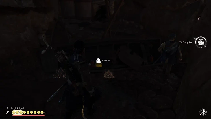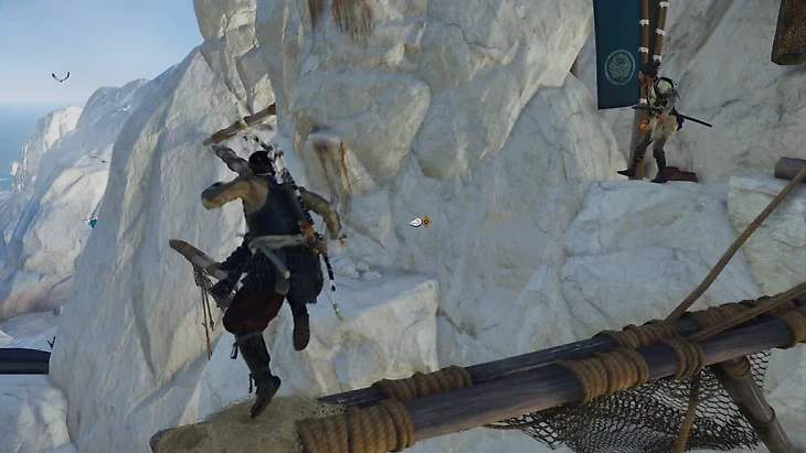 Вскоре вы столкнетесь с препятствием в виде поднятого бамбукового моста. К счастью, для Дзина это небольшое препятствие: используйте крюк Така, а затем потяните его, как вы делали это с баррикадой в пещере контрабандиста, когда впервые попали на остров. Продолжая путь, не забудьте подобрать припасы и кожу на правой стене.