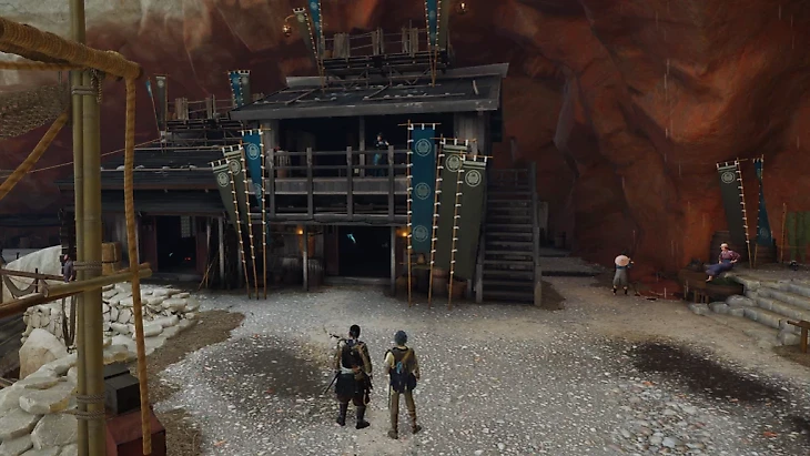 Но это удачный короткий путь, потому что теперь вы можете прыгнуть на другую сторону разводного моста. Там ищите рядом с подъемным мостом веревку, которую можно использовать, чтобы спустить ее для Тензо.