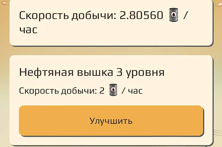 Качать уровень нефтяной вышки в разделе «Улучшения». Чем больше уровень выше – тем больше нефти в час вы получаете.