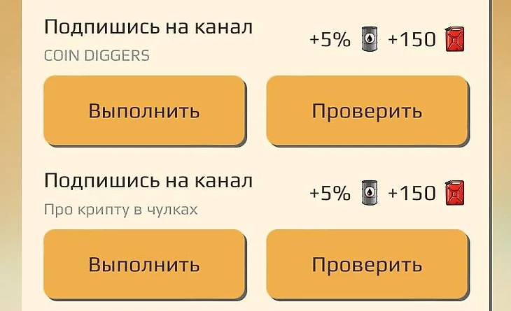 Выполнять задания в разделе «Улучшения». Пролистав чуть ниже, вы увидите список заданий. В основном это подписки на Телеграм-каналы, за которые вы увеличите скорость добычи нефти и получите бесплатные канистры.