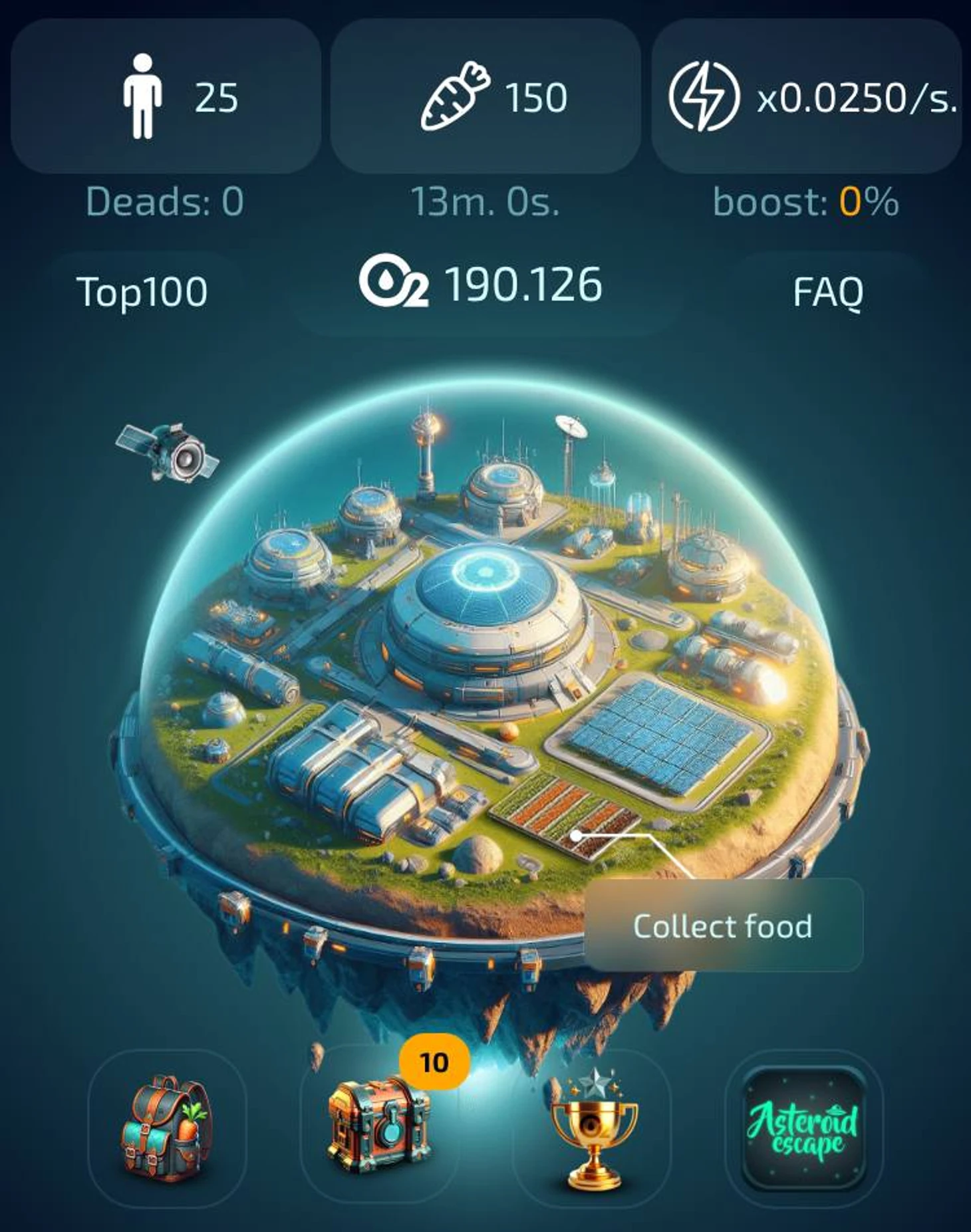 Oxygen Miner – игра-бот в Телеграме с элементами RPG и красивой графикой. В ней вам предстоит взять на себя роль лидера футуристического убежища на астероиде, добывать еду, балансировать ее потребление, увеличивать численность колонии и получать токены OXY.