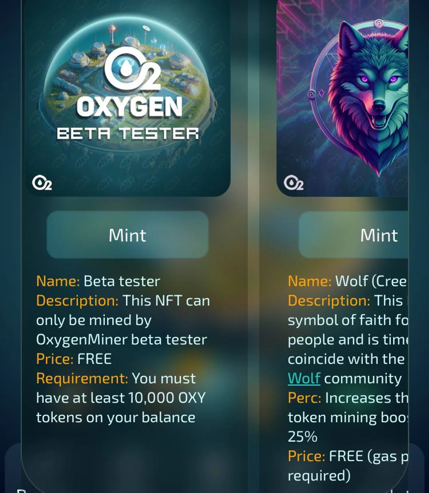 В Oxygen Miner есть нативная криптовалюта, с помощью которой можно купить NFT. Одна NFT (NFT Beta tester) можно купить за 10 тысяч OXY. NFT в проекте позволяют игрокам быстрее развиваться, увеличивая добычу ресурсов. Некоторые NFT также добавляют новых людей в колонию или позволяют сократить расход еды. Чтобы сминтить NFT, зайдите в раздел Wallet, пролистайте вниз и нажмите Mint. Для этого вам нужно отправить на свой кошелек хотя бы 0,06 Matic.