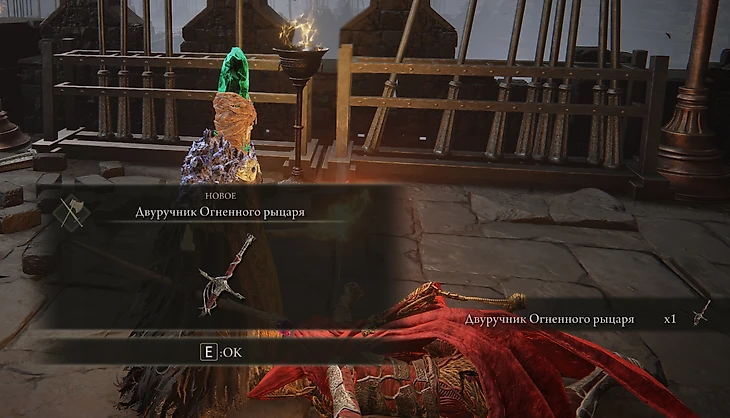 Для повышения шансов выпадения двуручника воспользуйтесь талисманом Серебряного скарабея или маринованной птичьей лапкой из основной игры. После убийства рыцаря пробегите немного вперед, поднимитесь на лифте и активируйте там благодать. Отдохните, чтобы мир обновился, и можно снова приступать к фарму. Вероятно, меч выпадет не с первого раза – как повезет.