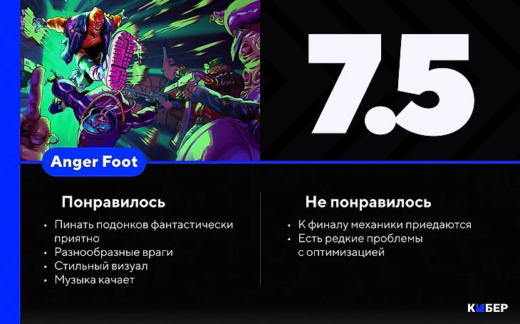 Обилие противников, интересные уровни, нескончаемый драйв – все это делает Anger Foot хитом, пусть и с недостатками. К финалу игра слегка выдыхается: механик не так уж много, а пинать врагов семь часов подряд, простите за богохульство, утомляет. На открытых локациях FPS временами проседает даже на RTX 4060. Сложность некоторых уровней кажется чрезмерной.