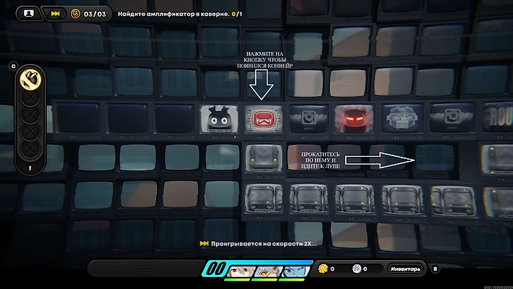 Пройдите до красной кнопки и нажмите на нее, сразу после переместитесь вперед, проехавшись по появившемуся конвейеру. Дальше идите к лупе и переходите в следующую зону поиска.