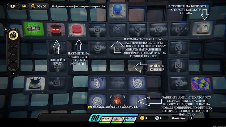 Здесь вы должны сначала одолеть врага. После нажимаете красную кнопку – это создаст внизу конвейер, который выталкивает вас наверх. Идите к блоку и наступите на него – это создаст комнату справа, где вам будет нужно нажать 1 раз на зеленую кнопку. Это изменит стрелку на блоке. Теперь толкайте его на синюю кнопку, чтобы изменить направление конвейера. Забирайте амплификатор и нажимайте на красную кнопку, которая появится внизу. По новому конвейеру выезжайте к финишу. Поучаствуйте в сражении, и квест завершится.