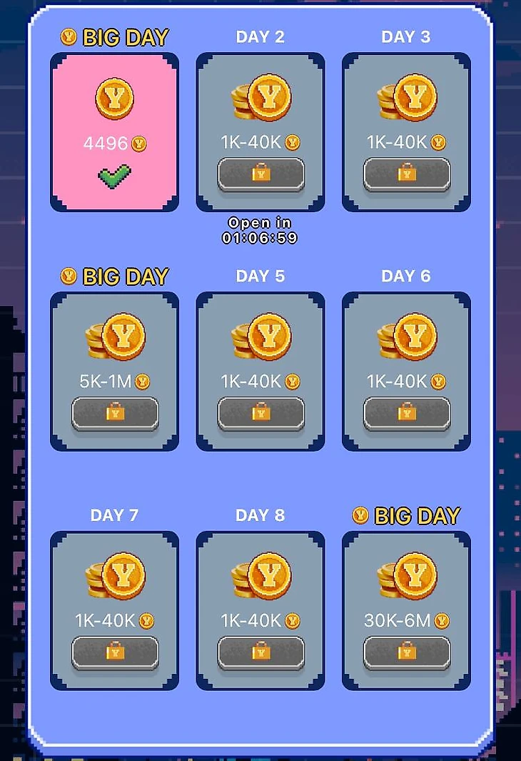Монеты можно получить, выполняя задания. Первое задание – ежедневный чек-ин в приложение. Каждый день отмечайтесь в соответствующем разделе, чтобы бесплатно получить монеты YesCoin. При привязке кошелька на TON вы получите в разы больше монет.