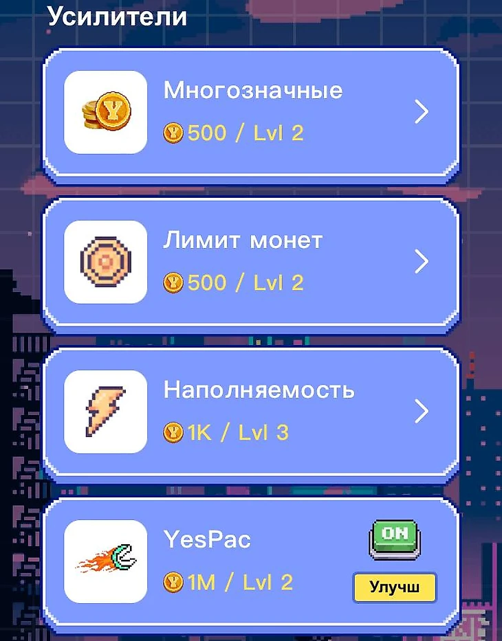 YesPac – дает вам собственного робота-автокликера, первый уровень которого стоит 500 тысяч монет. Автоматически собирает за вас монеты. Всего есть 5 уровней питомца.
