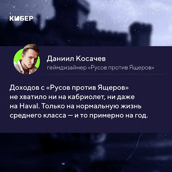 Доходов с «Русов против Ящеров» не хватило ни на кабриолет, ни даже на Haval. Только на нормальную жизнь среднего класса – и то примерно на год.