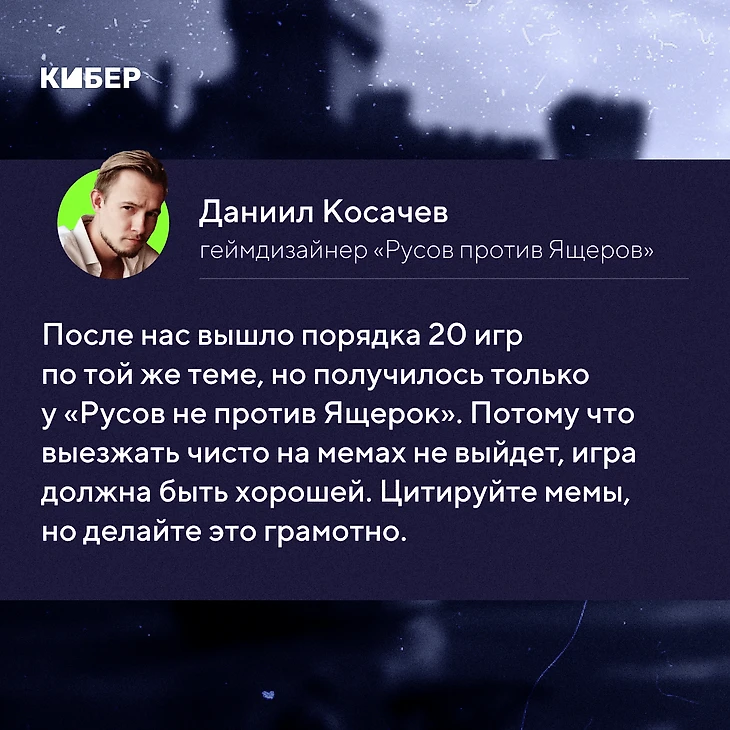 – Ага, мы выехали на мемах, паразитируем жестко. Вообще после нас вышло порядка 20 игр по той же теме, но получилось только у «Русов не против Ящерок». Потому что выезжать чисто на мемах не выйдет, игра должна быть хорошей. Цитируйте мемы, но делайте это грамотно. Не факт, что во второй части людям будут интересны только мемы. Мы работаем в первую очередь над игрой, геймплеем, но все равно не уверены, что выгорит.