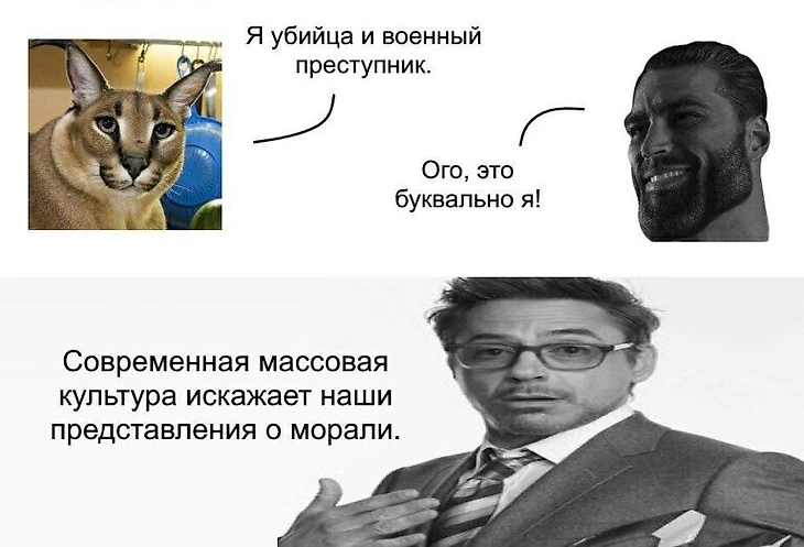 Из «Железного человека» тоже сделали мемы. На них Тони Старк раскидывает руки, преисполненный в своем познании и абсолютно довольный собой. В мемах это сопровождается ироничными надписями о том, как легко удалось чего-то достигнуть.